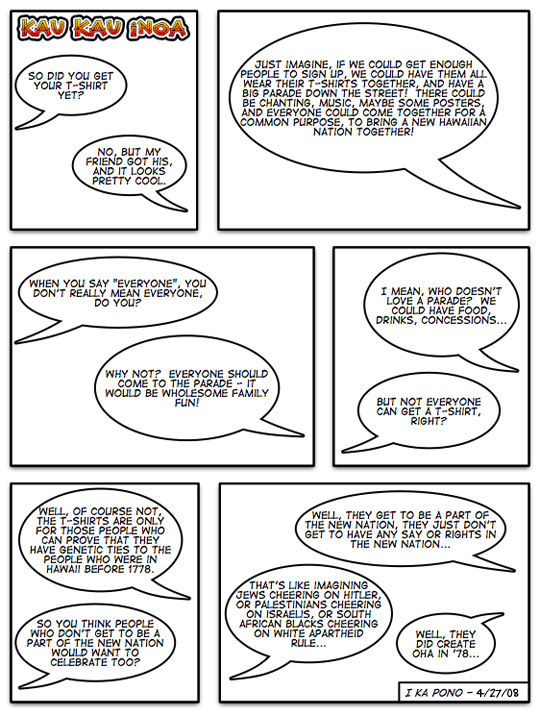 Eric Seabury writes: "Amen, Zero Shibai! It is high time we start doing what the politicians won't do, which is openly debate the triple threat of OHA, the Akaka bill and the Kau Inoa "initiative", who's ultimate goal is to "bite the hand that feeds it" with creating a separate, race-based Hawaiian government, while continuing to be pumped up with American tax dollars that EVERY Hawai'i citizen works and sweats to make.