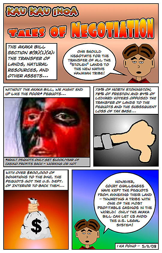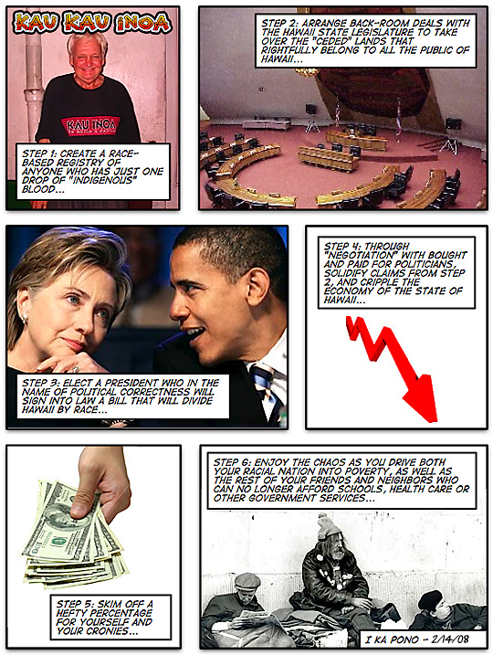 With the negotiating skills just demonstrated by our AG and given his bias in favor of the Akaka bill and Hawaiian sovereignty, the so-called non-Hawaiians will be lucky if he doesn't end up giving up the entire state. Or is that the plan B?"