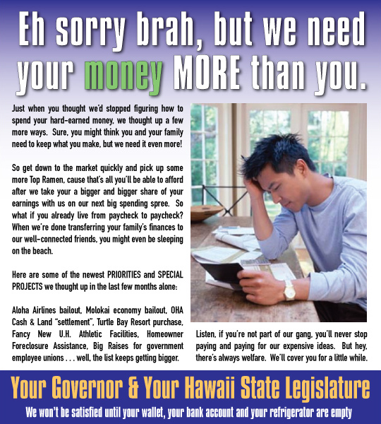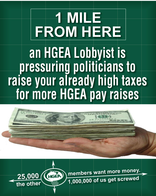 Government Employee Union for State AND City Jobholders Fight Back New HGEA Ad Campaign Launched on Heels of Successful Tea Parties in Hawaii; The Emotionally Detached Union Bosses Show Zero Empathy (or even Aloha) for Residents of the Aloha State during Current Recession