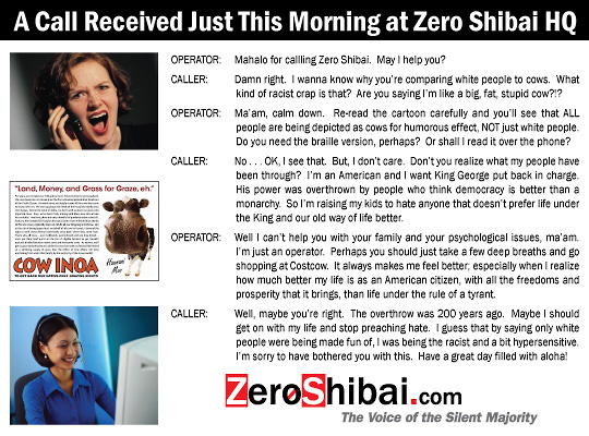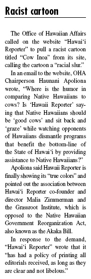 By the way, the Office of Hawaiian Affairs wrote about Zero Shibai's "Cow Inoa" cartoon (featured on HawaiiReporter.com) with a charming little article in OHA's current issue of their taxpayer-funded magazine Ka Wai Ola: