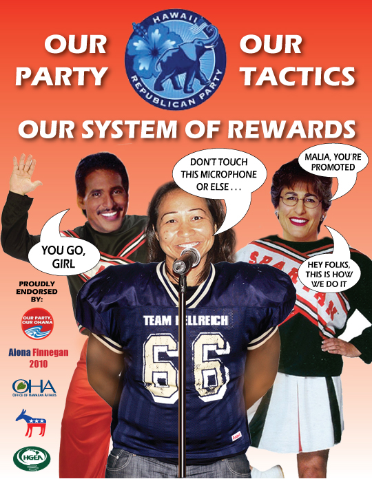 DUKE AIONA: "In my unconditional and enthusiastic endorsement of Malia Gray, I have ironically described her as "inclusive" because of her strongarm tactics for excluding Republicans from discussions about our party's platform. And in our party's deeply held spirit of Ainokea, I wish to offer a special mahalo to our leader of the ever-shrinking minority caucus, Lynn Finnegan, for diverting all those weeks of time and effort at her state legislative office away from fighting the Democrats, to promoting the Our Party Our Ohana campaign instead. I promised her that she could be my running mate for Lieutenant Governor if she passed her audition by doing the dirty work of putting my young and loyal cronies in charge of the party. However, I'm a little nervous about the race for governor, since after all the campaigning by Lynn's Ohana group, Malia barely won enough votes to beat that anti-tax, anti-big government Ron Paul guy. With results like that, Abercrombie is going to clean my clock. I'll be lucky to survive a primary challenge. Plus, today’s vote wasn’t much of a mandate, especially with all the thousands of manhours Lynn, Malia, Jonah and their running mates spent working on this campaign from Lynn Finnegan’s State office. Only 140 votes, c’mon. I only hope that Jonah's use of our party to organize outreach to church groups and sovereignty activists on my behalf helps people forget about the sorry, anti-family, anti-business record of the Aiona/Lingle administration."