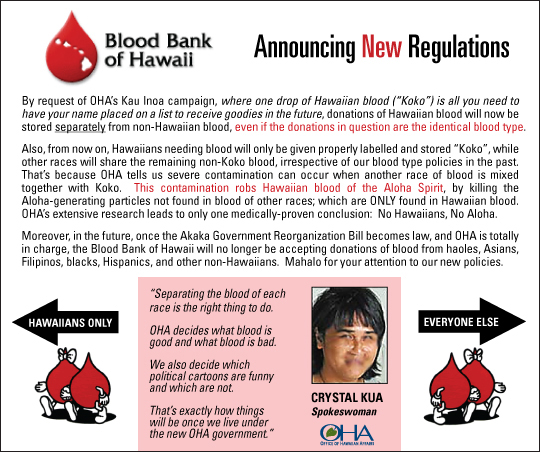 OHA has had such a dismal track record of actually advancing the Hawaiian People. It seems as if they only want a regime with a small class of rulers and a large caste of subjects. This is why they attempt to subvert the actual will of the people through the courts and through politicians who are literally in OHA's pocket. This is similar to the ACLU's back door tactics of social engineering to mold the populace into their own set of pawns. What a shame and a sham. (Cow Inua!...HEH!)