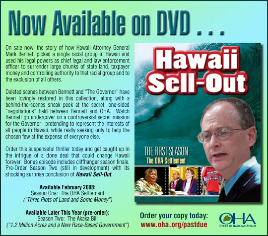 BENNETT: "I do not believe OHA is a bunch of money-grubbing politicians and bureaucrats—the Trustees I have dealt with are dedicated public servants, who want to do everything possible to help their beneficiaries. I do not believe OHA has a highly unsuccessful track record....I do not advance separatism—I support this settlement (season one DVD) because I believe it appropriately and fairly fulfills the State's legal obligations and I support the Akaka Bill (season two DVD) because I believe that it is just and fair, and in the best interests of Hawaii and our people."