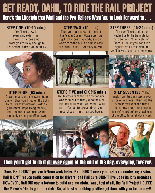 Interestingly, an intensive survey of those rescued from TheTrain revealed that the composition of passengers was entirely made up of those who were previously riders of TheBus. In fact, our reporters could not find one single rescued passenger who said that he or she stopped commuting in a private vehicle in order to become a rider of TheTrain. Moveover, no politicians, no administration officials, no HGEA members, no HSTA members, nor any leaders of pro-rail groups were among those rescued from stranded trains. Either they all left their government jobs really early on a Friday (which can certainly be expected) or they never intended to be among the poor, huddled masses that ride public transportation. Perhaps riding to and from work in luxury cars on roads congested at rush hour wasn't as much of a crisis as we thought during the mad rush to approve and build TheTrain . . . especially if they never really intended to give up their cars, already knowing from their own studies that TheTrain wouldn't help congestion one little bit?