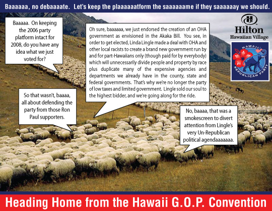 The 'Sheeple' Have Spoken Under Lingle's Direction, Uninformed Republican Delegates Overwhelmingly Support Creation of a Racist OHA Government for Hawaii's New Alii to Run On Behalf of Hawaii's Part-Hawaiian Commoners . . . With Everyone Else's Money