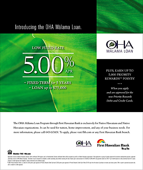 Hat Tip to www.hawaiipoliticalinfo.org for alerting us to First Hawaiian Bank's new loan offering exclusively for "Native Hawaiians and Native Hawaiian organizations". Seems like the potentially illegal special treatment for one ethnic group keeps coming, as white folk, Japanese, Chinese, Koreans, Filipinos, Blacks, Micronesians, and others will instead pay the much higher posted interest rate of 7.64% APR for a similar fixed-rate loan on www.fhb.com: