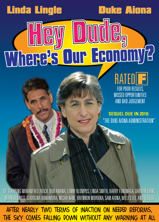 LINDA LINGLE: "Attention State employees. I am the governor and your boss. I am so relieved to see so many of the beneficiaries of my patronage system here today. Good, you got my memo. Listen, you know why I called you here today and you know exactly what to do . . . if you know what’s good for your job and your future, that is. Let me be clear: If even one of you votes for Dan Douglass, you may as well pack up your belongings and send your resumes to Bob Awana's Far East Escort Service. With that said, if you need to vote early and leave early, even before nominations are pau or delegates have even been certified, well that's okay by me. Outgoing county chair Tercia has been instructed to ignore all complaints about procedure and rules violations. Now, as for Malia, Jonah and the sanctified Our Ohana team, please carry on the great work you do for us in stifling debate and keeping the party silent on major issues of the day. And please accept our blessings to use the same tactics to pursue our administration's agenda . . . which is, of course, to divert all party resources to Duke’s race. Like I said at the Lincoln Day dinner a few weeks ago, Duke’s campaign to succeed me as governor is ALL that matters. You want to keep your state jobs, then listen good. Forget crazy ideas like taking back the legislature and forget about promoting conservative values. Yuck! It's so much better having sovereignty activists and Aiona/Finnegan campaign workers like Malia and Jonah taking over our party than wasting valuable time and energy pushing for tax cuts and streamlining of government. Malia's commitment to pursuing my unholy agenda at all costs is the reason why I describe her in my endorsement as a 'unifier' who believes in 'teamwork'."